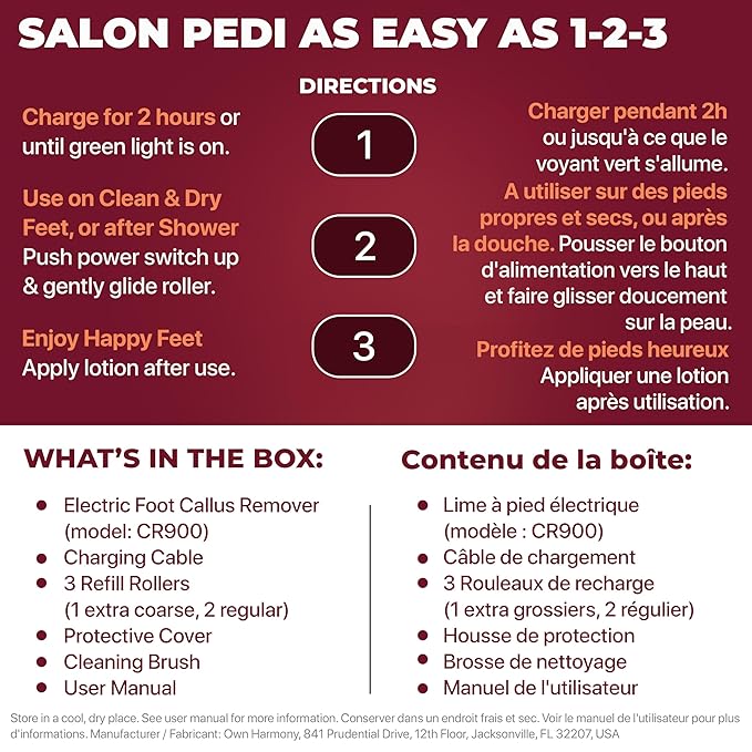 - HAPPY FEET TIPS: Charge for 2 hours; Use on clean and dry feet, or after shower; Gently glide roller on heels, toes and soles of feet – do not apply pressure; Use extra coarse roller for heavy callus build-up; Use regular coarse roller to maintain smooth & soft feet