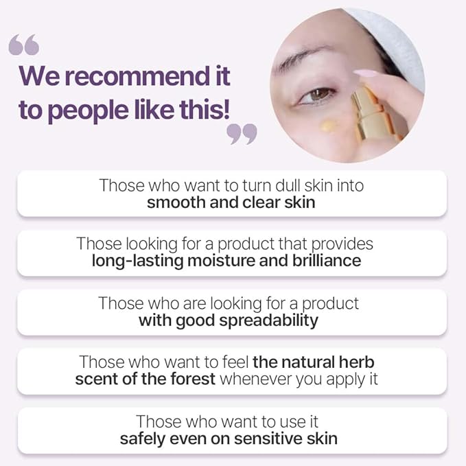 - [Another Benefits / Features] It makes the skin glowy right after applying it. Not only moisturizes the inside & outside but also keeps moisture with the Triple combination of Polymer, Medium and Small Molecules. Long persistence of moisture & brilliance, soft application. Turning dull skin into smooth and clear skin. * Natural Herb Scent, Natural Color of Plant extracts (No ! artificial scent & color) → Good for Healing!