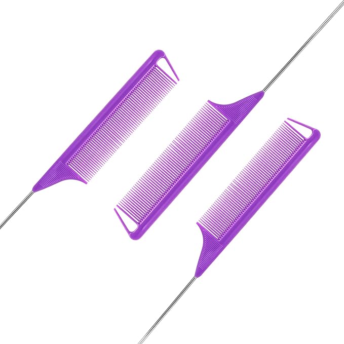 Rat Tail Steel Pin Teasing Combs Set: 3 Pack Hair Styling Combs for Parting and Teasing All Hair Types (Purple)