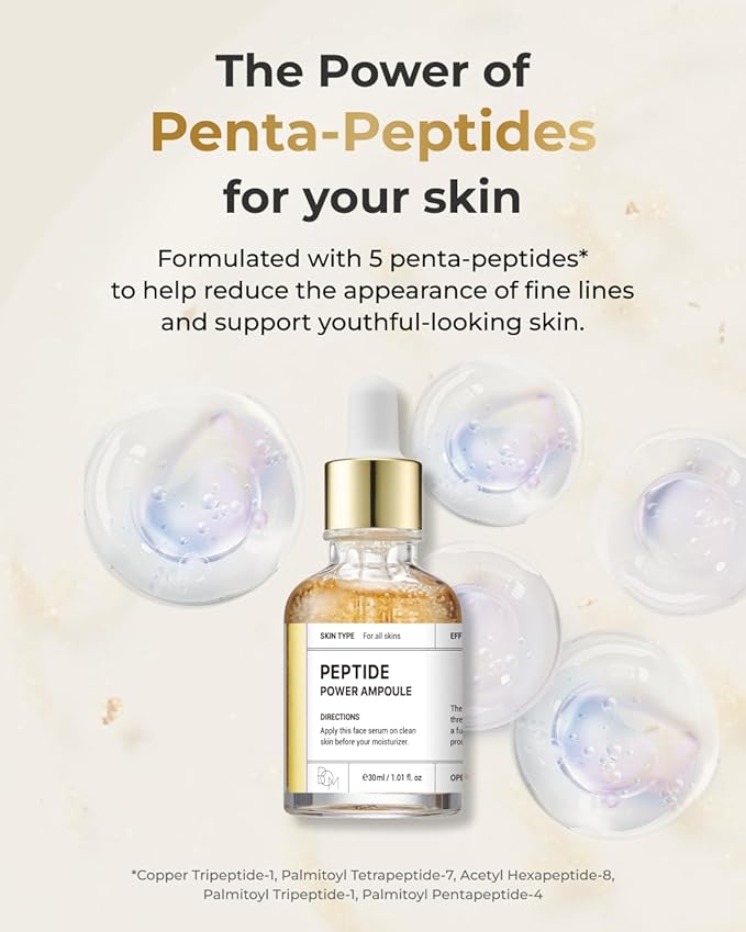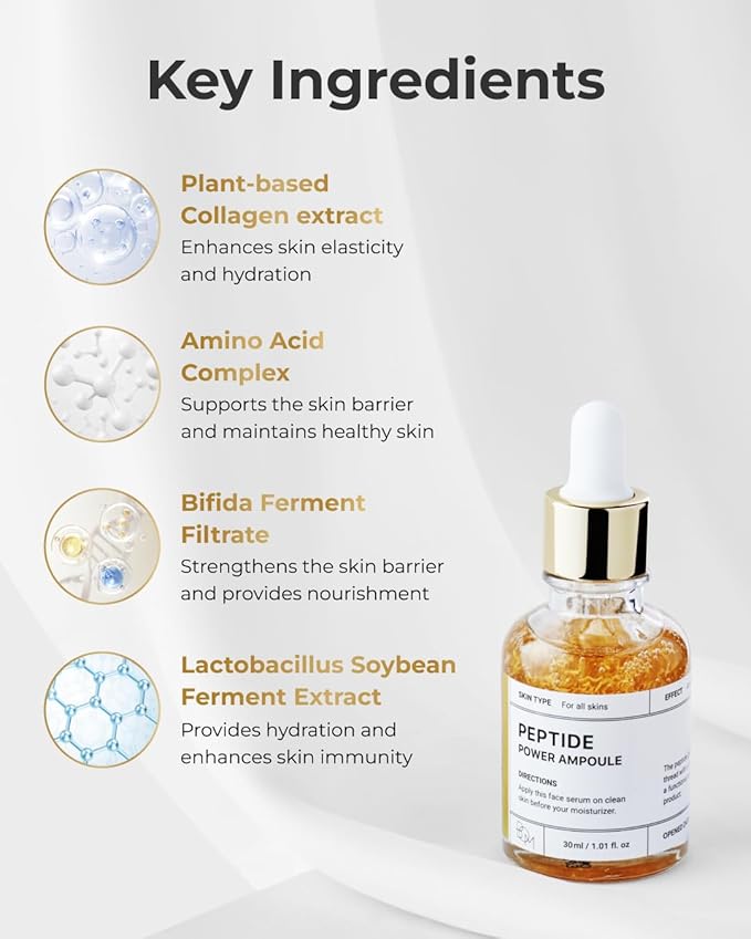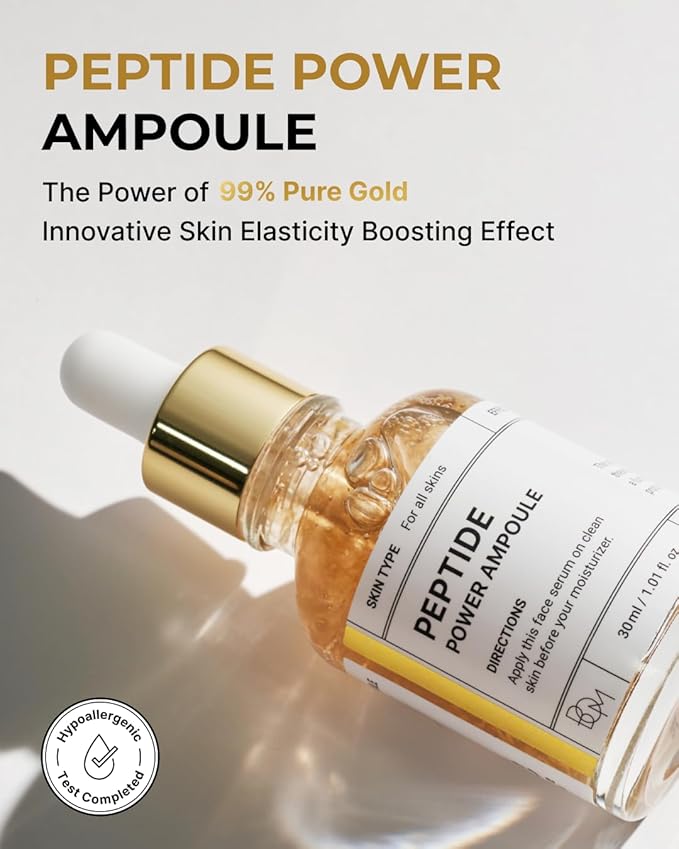 BOM COSMETICS Peptide Power Ampoule 1.01 Fl Oz, Penta-Peptide with 24k Gold Thread and 99% Pure Gold for Skin Collagen Boost, Firming Serum to Improve Elasticity and Radiance, Korean Skin Care
