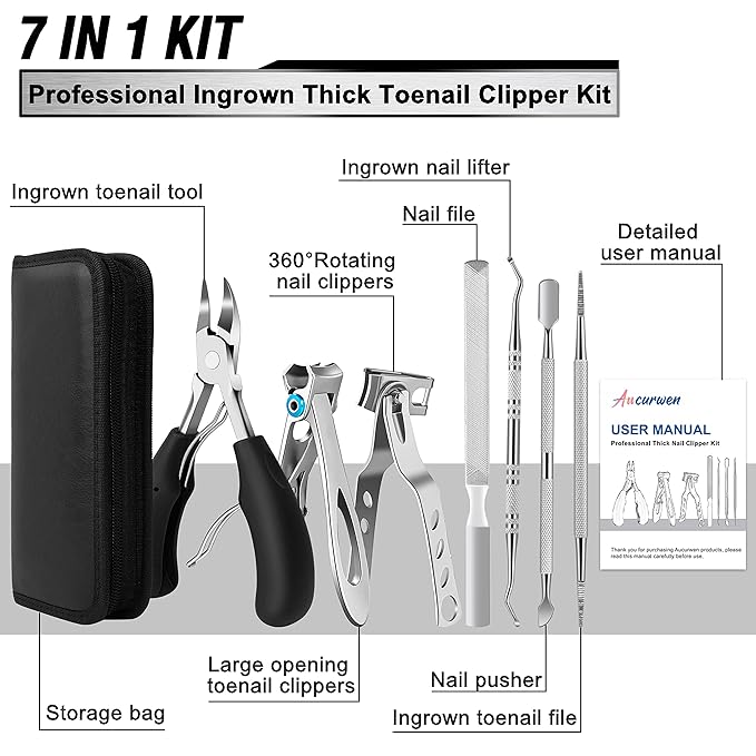 - 【What You Get】: 7 in 1 professional nail clippers, you will get 1× ingrown toenail tool + 1× large opening toenail clippers + 1× 360° rotating nail clipper + 1×ingrown toenail file + 1× ingrown nail lifter + 1× nail pusher + 1× nail file + 1× user manual + 1× storage bag, if you are not satisfied with the nail clippers, please contact us for a replacement, we will serve you whole-heartedly.