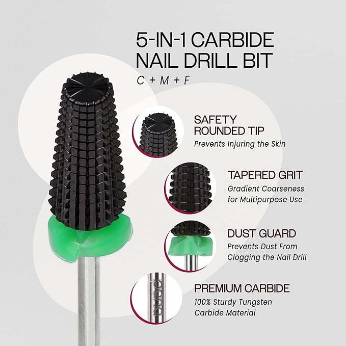 - 🎀 【EFFICIENT & PRECISE】: The 5 in 1 nail drill bit features razor-sharp, tapered edges and a smooth, rounded top for safe, precise removal of nail enhancements like acrylics, hard gels, and poly gel. It quickly cuts through layers while protecting cuticles and sidewalls for controlled, damage-free use.