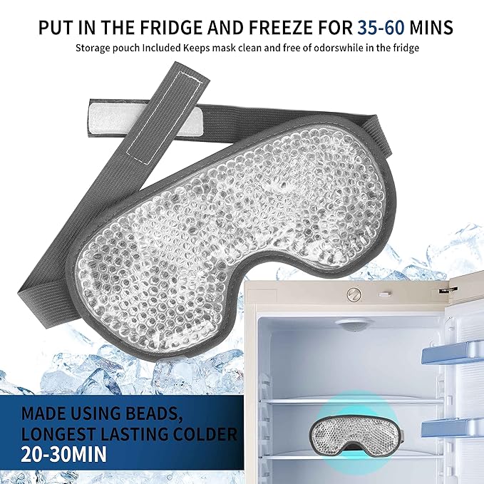- RELIEVE DISCOMFORT: The gel bead eye mask is a quick and easy way to relieve your eye discomfort. Freezing the cooling gel eye mask and put it on your eyes to reduce puffiness from a night of poor sleep or a late night, or to relieve tired eyes that have been staring at a computer all-day