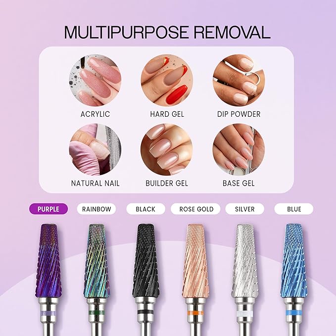 - 🎀 【EFFICIENT & PRECISE】: The 5 in 1 nail drill bit features razor-sharp, tapered edges and a smooth, rounded top for safe, precise removal of nail enhancements like acrylics, hard gels, and poly gel. It quickly cuts through layers while protecting cuticles and sidewalls for controlled, damage-free use.
