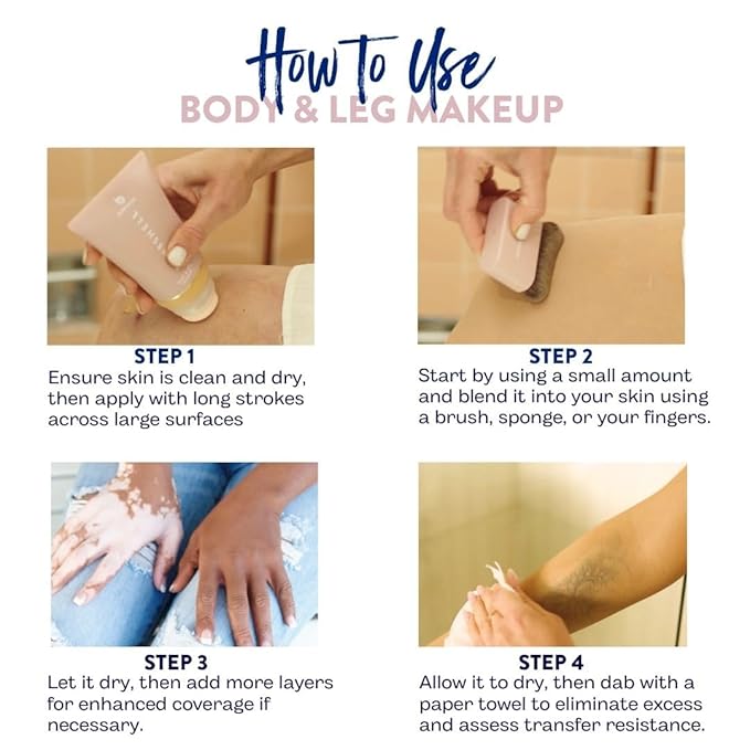 - Simple Application for Multi-Day Results: Get gorgeous, glowing legs in minutes; Shave 24 hours before application, then blend a small amount of the body makeup waterproof no transfer onto your clean, dry skin with either a brush or your hand; Within 5 minutes, your tattoo coverup makeup will be dry and stain-free; Enjoy your Best Bronze glow for days
