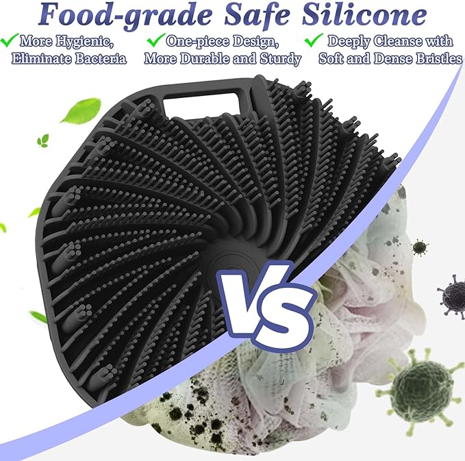 - 【Easy-to-clean & Hygienic】 Silicone material is easy to clean, quick-drying and not easy to produce bacteria. You just need to rinse it and hang to dry. Package includes: back brush x 1; soft brush x 1; face brush x 1; body buffer x 1; strong adhesive hook x 2.