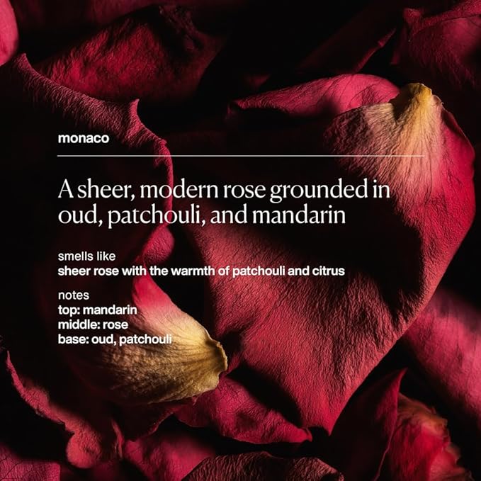 - UNIVERSAL SCENT AND DESIGN: Made for everyone, featuring Monaco's modern rose scent grounded in oud, patchouli, and mandarin, appealing to all genders.