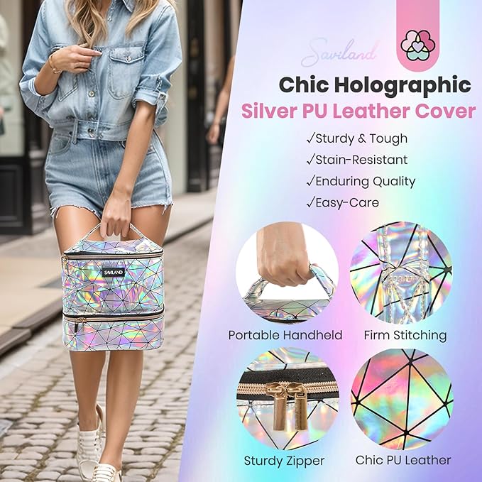 SAVILAND Nail Polish Organizer Bag: PU Leather Nail Kit Organizer Holds 30 Bottles & Nail Lamp, Holographic Nail Supply Organizer Nail Polish Holder Case Nail Organizers and Storage Box for Nail Tech