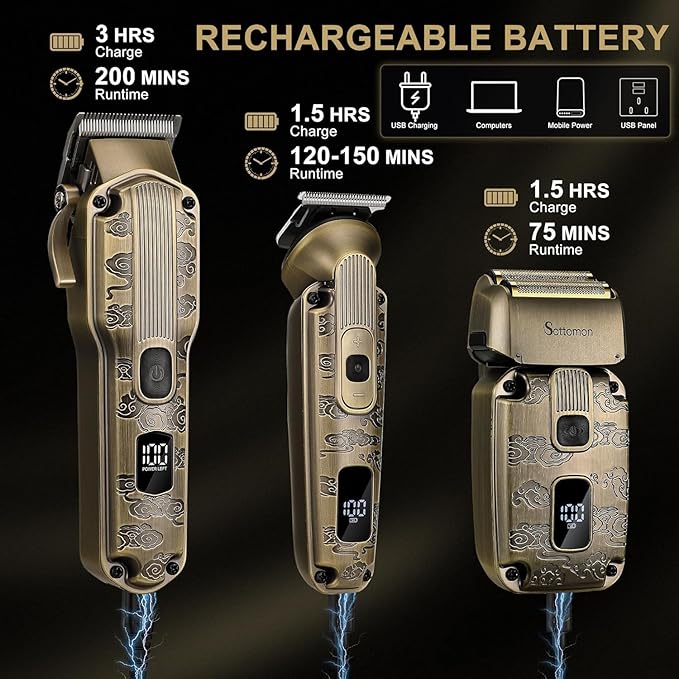 - High Performance Motor & Protable: Equipped with durable motors, our trimmer kit can provide long-lasting running for you, hair clipper takes about 3 hours fully charge to allow 200 minutes working time; T-blade Trimmer support 120-150 minutes running after charged with 1.5 hours; Foil shaver shaving 75 minutes after for 1.5 hours charging. The cordless trimmer set and travel lock design making it easy to take with you wherever you go