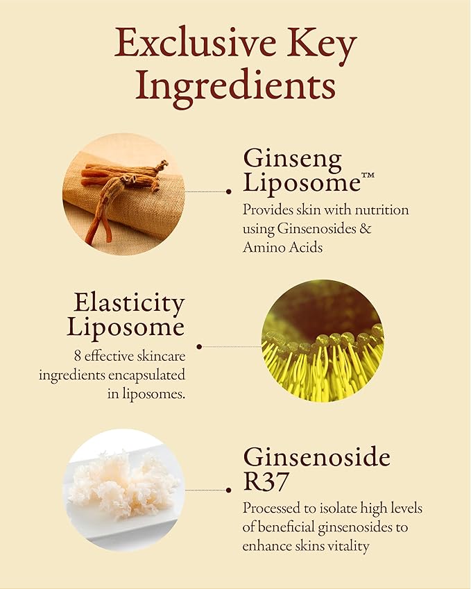 - KEY INGREDIENTS - The formula features Ginsenoside R3, derived from concentrated ginseng extracts, which enhances skin elasticity and resilience. Additionally, it includes micro-ginseng for optimal nutrient delivery, ultra-low molecular weight hyaluronic acid for hydration, and elastic liposome technology to ensure effective absorption and lasting benefits.