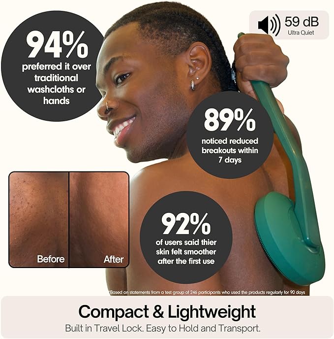 - DURABLE AND TRAVEL-READY: Built to last with an IPX7 waterproof rating, the shower scrub brush is safe to use in the shower or bath. Plus, the USB-C rechargeable battery and travel lock ensure it’s perfect for both daily use and on-the-go cleansing