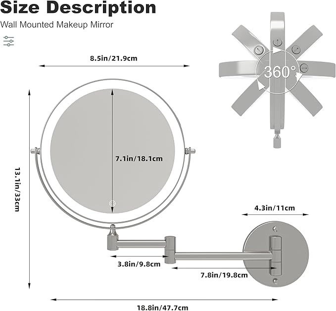 - 💫𝐄𝐱𝐭𝐞𝐧𝐝𝐚𝐛𝐥𝐞 𝐀𝐫𝐦 𝐰𝐢𝐭𝐡 𝟑𝟔𝟎-𝐝𝐞𝐠𝐫𝐞𝐞 𝐑𝐨𝐭𝐚𝐭𝐢𝐨𝐧: The extendable arm reaches up to 18.8 inches, allowing you to position the mirror at the perfect angle for your routine. The swivel mirror rotates 360 degrees, offering a full range of motion to find your ideal viewing angle. When you're done, you can fold it back against the wall to save space. This versatility makes it ideal for any bathroom or vanity setup.