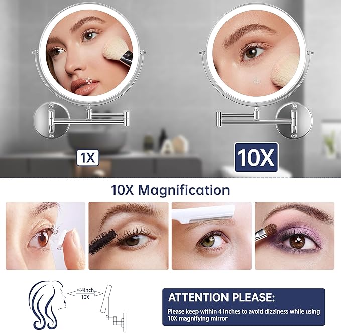 - 🔍𝐃𝐮𝐚𝐥-𝐒𝐢𝐝𝐞𝐝 𝐌𝐚𝐠𝐧𝐢𝐟𝐢𝐜𝐚𝐭𝐢𝐨𝐧 𝐟𝐨𝐫 𝐏𝐫𝐞𝐜𝐢𝐬𝐢𝐨𝐧: The bathroom mirror for wall offers both 1X and 10X magnification. The 1X side is great for general makeup application and hairstyling, while the 10X side is perfect for precise tasks like applying eyeliner or tweezing. To avoid dizziness, keep your face within 6 inches of the 10X magnifying mirror. This dual-sided design gives you flexibility for both detailed work and broader views.