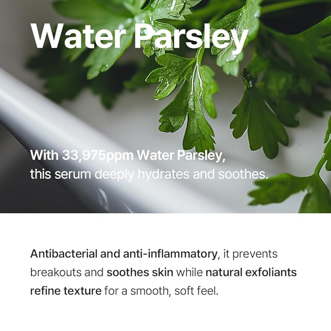 - 🌿 CONCENTRATED WATER PARSLEY EXTRACT (33,975ppm): Infused with a high concentration of Korean Water Parsley (Oenanthe Javanica), this serum acts as a powerful purifying agent for your skin. It helps cool down heated skin and soothe irritation, providing a refreshing detox effect for a clearer complexion.