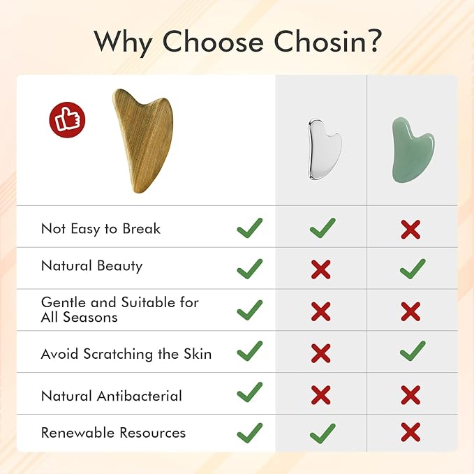 - Gentle on Sensitive Skin: Made of 100% green sandalwood, the surface is hand-polished to ensure smoothness and no burrs. Unlike jade and stainless steel, CHOSIN gua sha is a natural facial massager tool that is gentle and non-irritating, allowing you to experience a more comfortable face massage journey, and is ideal for sensitive skin.