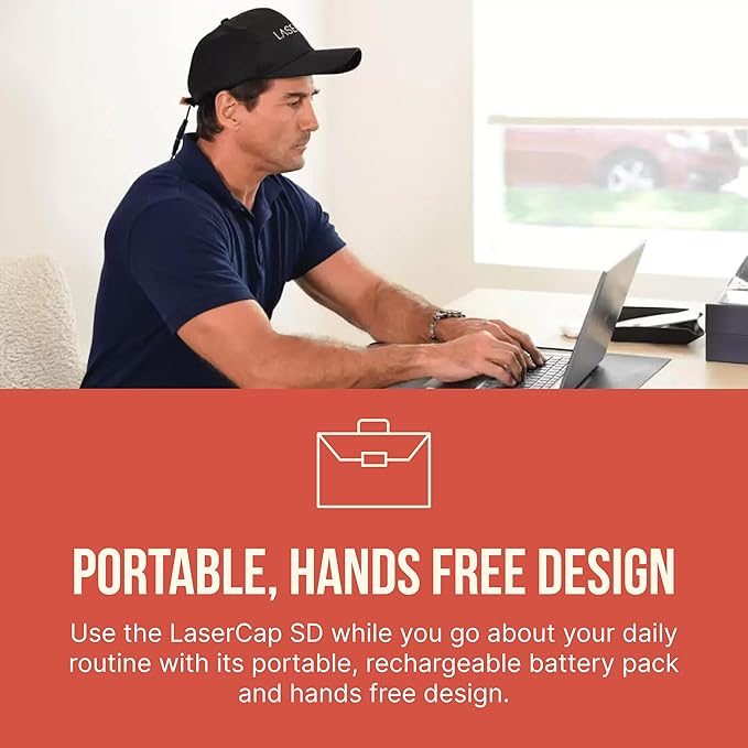 - Portable, Hands-Free Design - Lightweight and discreet, the LaserCap SD fits comfortably under a standard baseball cap. Powered by a rechargeable battery pack, it offers freedom of movement so you can treat your hair loss while cooking, relaxing, or working.