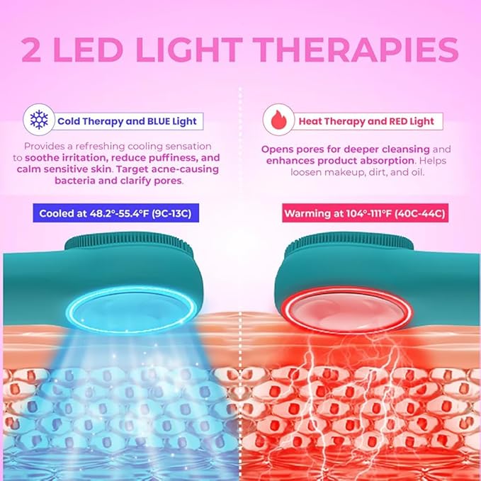 - Dual-Sided Design for 2-in-1 Skincare - Get the best of both worlds with the RIKI LOVES Silicone Facial scrubber. One side features fine, soft silicone bristles (in two sizes) for deep cleansing and gentle exfoliation. The other side delivers Heating, Cold Compress, and LED light therapy for a soothing spa experience—all in one stylish device.