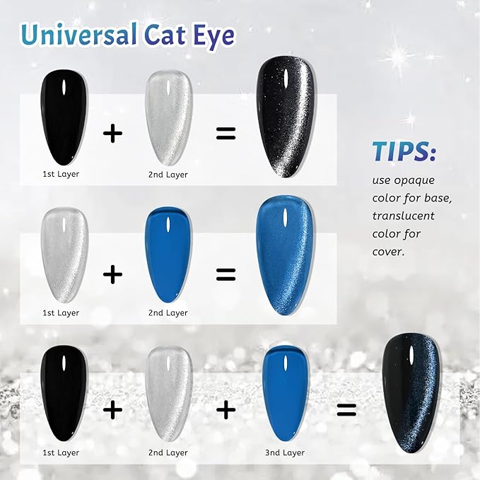 - You Will Receive: 9 bottles of blue jelly gel nail polish, 1 bottle of versatile cat eye , 1 bottle of base coat, 1 bottle of top coat, 1 magnet, this blue color jelly gel polish set, the cat eye gel nail polish features coarse magnetic particles. Upon close inspection, gray magnetic particles are visible, but when layered over transparent colors, they do not diminish the overall cat eye effect.