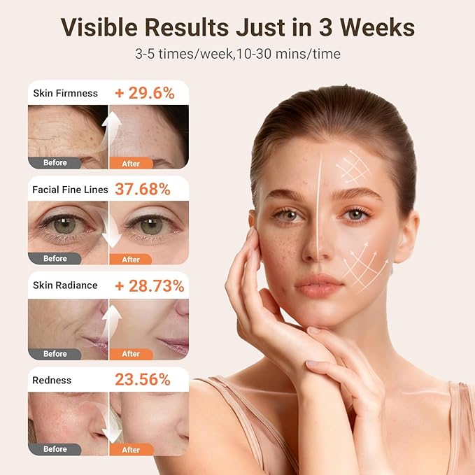 - Visible Professional Results: Based on clinical feedback, 4 weeks of continuous use 3-4 times a week for 10 minutes resulted in a 96.9% reduction in wrinkles and fine lines, a 98.2% increase in skin firmness and smoothness, 91.5% reported significant improvements in oil control and pore size, and a visibly revitalized complexion.