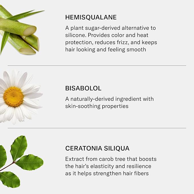 - Hero Ingredients: Hemisqualane – a plant sugar-derived silicone alternative that reduces frizz, provides color and heat protection, and keeps hair smooth. Bisabolol – a naturally-derived ingredient that soothes skin. Ceratonia Siliqua – carob tree extract that boosts elasticity and strengthens hair fibers. Moringa Oleifera – horseradish tree extract that helps protect hair from pollution and UV damage. Squalane – a plant sugar-derived moisturizer that nourishes, restores luster, and adds shine and softness.