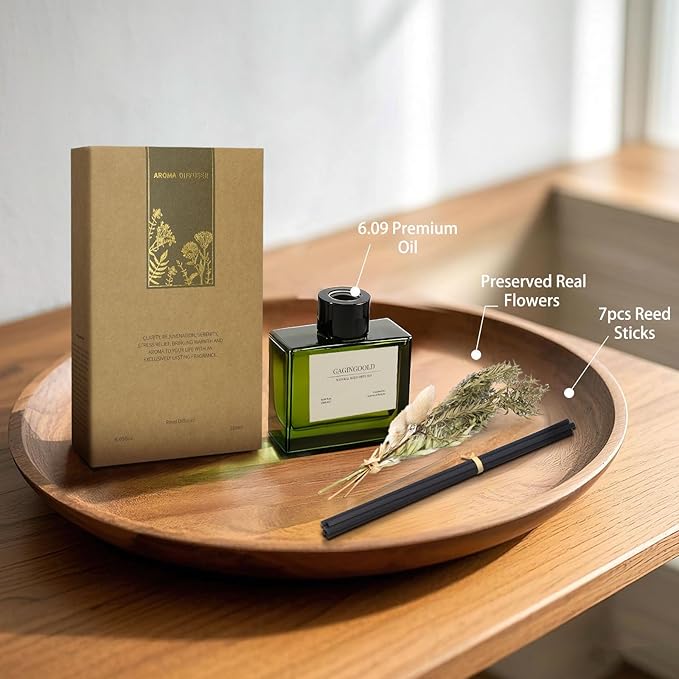 - Premium Complete Set: Enjoy everything you need: 6.09 oz (180 ml) of non-toxic sandalwood fragrance liquid, 7 premium reed sticks, a stylish recyclable glass vessel, real dried flowers, and a gift box - all designed for effortless customization of your home's ambiance.