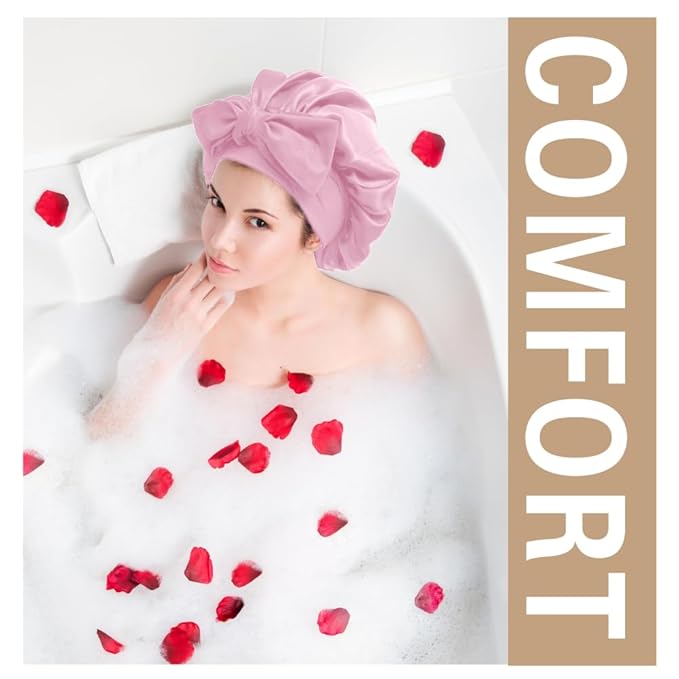 Silk Bonnet for Sleeping Women, Ajustable Hair Bonnet for Curly Hair with Tie Band Shower Caps Pink,Large
