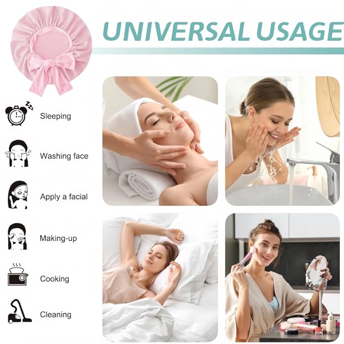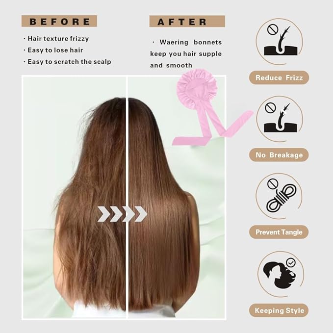 - VERSATILE USE:This satin bonnet for sleeping also convenient for washing, showering and skincare, No matter makeup, cleaning, cooking, studying, working etc.It's lightweight, won't add much extra weight on your head.Hand wash in cold water and air dry to extend bonnet life