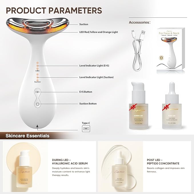 - Tightening, Brightening, Soothing: Enjoy a comfortable face and neck massager at home! This facial massager has gentle vibration massage and suction mode with mild heating and LED light therapy (red, yellow, and orange light) to improve elasticity and combat fine lines and wrinkles, tech neck, puffiness, and uneven skin tone.