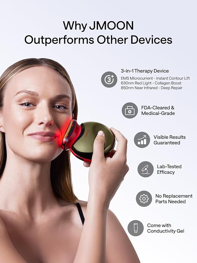 - Your All-in-One Beauty Ally — No Fuss, Just Glow - Tired of swapping attachments? JMOON beauty device delivers complete red light therapy for face and microcurrent facial device benefits in one elegant tool. Simply switch modes — no extra parts. More than a device, it's your effortless path to self-care and radiant skin.