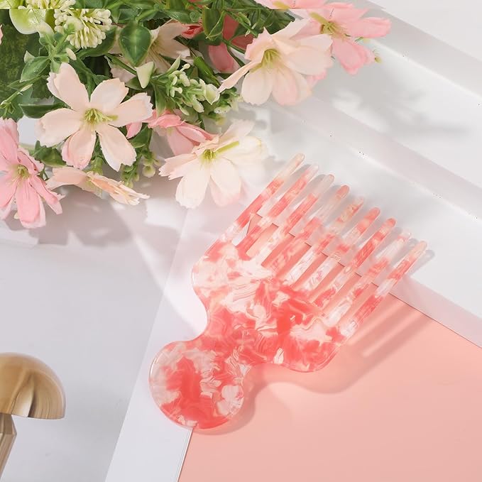 Wide Tooth Hair Pick Comb for Curls, 12cm/4.72in Detangling Lifting Comb Long Tooth Afro Pick Hair Styling Tool for Women Men Barber Supplies (Floral Pink)