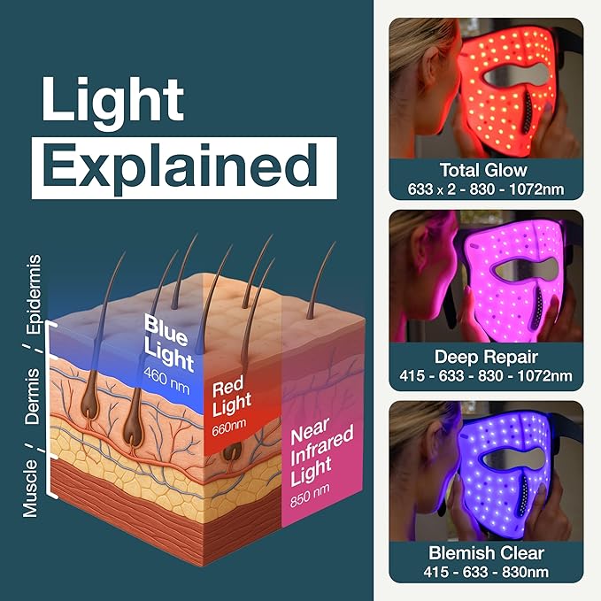 - Advanced Skin Rejuvenation Technology: Experience powerful red light therapy for face with 4 different light wavelengths. Red (633nm), Near-Infrared (1072nm), and Blue Light (460nm) work together to boost collagen production. Reduces wrinkle depth by 36%
