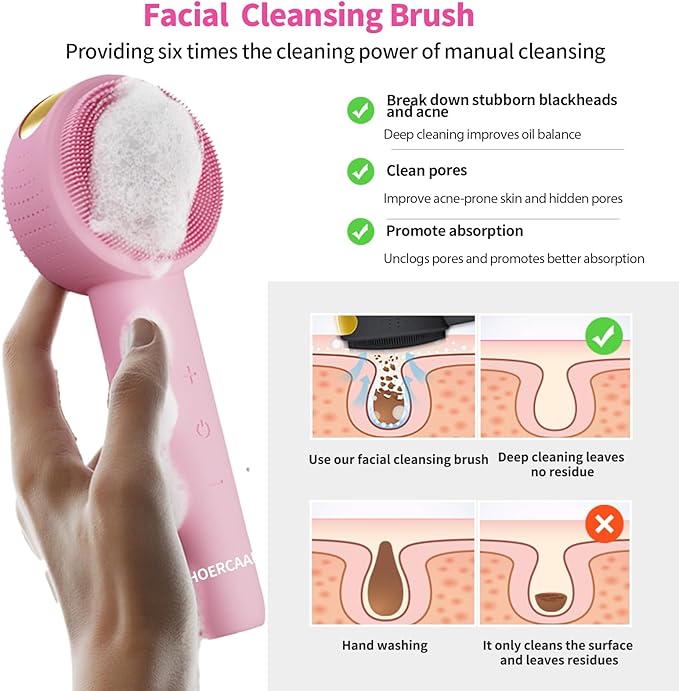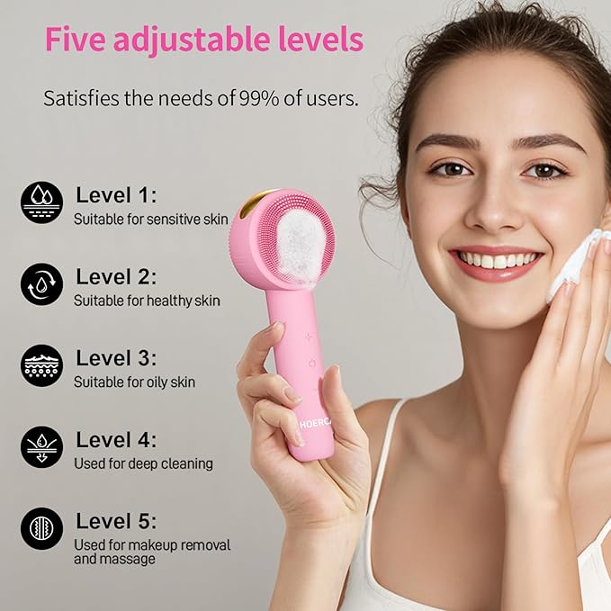 - 【5 Adjustable Intensities】Five vibration levels allow you to customize cleansing power for your skin type — from gentle care for sensitive skin to deeper cleansing for oily or combination skin