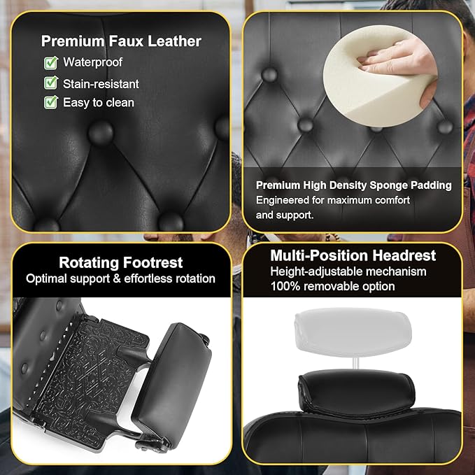 - 【Quality Materials】: The seat of the barber chairs for barbershop is covered with PVC artificial leather, which is skin-friendly and breathable, wear-resistant, and easy to clean. In addition, the seat is filled with high-density memory foam, soft and elastic. The galvanized surface is rust-resistant. It is also equipped with a steel footrest