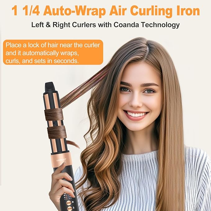 - Automatic Wrap Curling Barrels:1 1/4 Inch Auto-wrap curling barrels use high-velocity airflow to attract and wrap sections of hair automatically—no twisting or clamping needed. Create natural, voluminous curls quickly and evenly, suitable for various hair lengths and textures. Includes 2 auto-wrap hair curlers to curl hair in left and right,you can create stunning curls in different directions, allowing you to achieve natural curls effortlessly. Get long lasting curls after using the cool shot button.