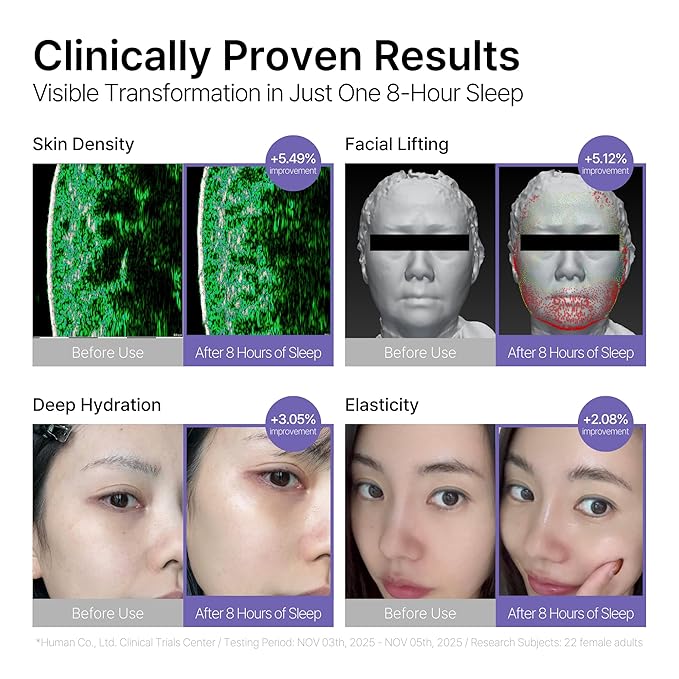- [CLINICALLY PROVEN OVERNIGHT RESULTS] Wake up to a visible skin transformation. Clinical trials after 8 hours of sleep show a 5.12% improvement in lifting, 5.49% in skin density, 3.05% in deep hydration, and 2.08% in elasticity. It is the ideal solution for addressing "sleep aging" caused by dry environments and nightly facial friction.
